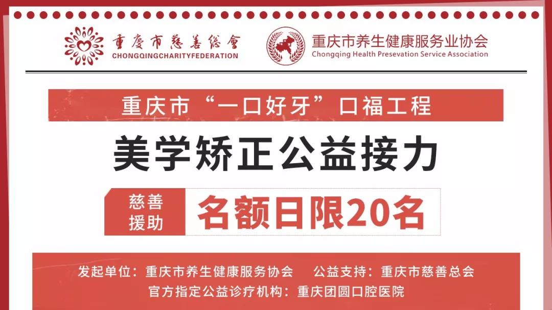 院长表示:为进一步倡导世界卫生组织“健康中国2030”计划,推进“健康重庆”建设,提高市民口腔质量,重庆市养生健康服务业协会特别发起“一口好牙”口福工程行动,由重庆市慈善总会提供百万公益基金援助,重庆电视台、腾讯·大渝网等作为媒体支持、现决定针对,凡需要种牙或牙齿矫正的市民等,由重庆市养生健康服务业协会官方指定公益诊疗机构——重庆团圆口腔医院开展公益口福工程行动,提供多方面口福公益补贴,有效帮助市民提升口腔意识,助力全民8020口腔健康的早日实现。